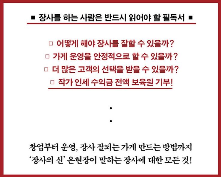 나는 장사의 신이다를 통해 저자 은현장의 장사 철학과 가치관을 배우고, 평소에 간과하던 진심과 간절함을 되새기게 해 줬던 은현장에게 감사의 인사를 전하고 싶습니다.